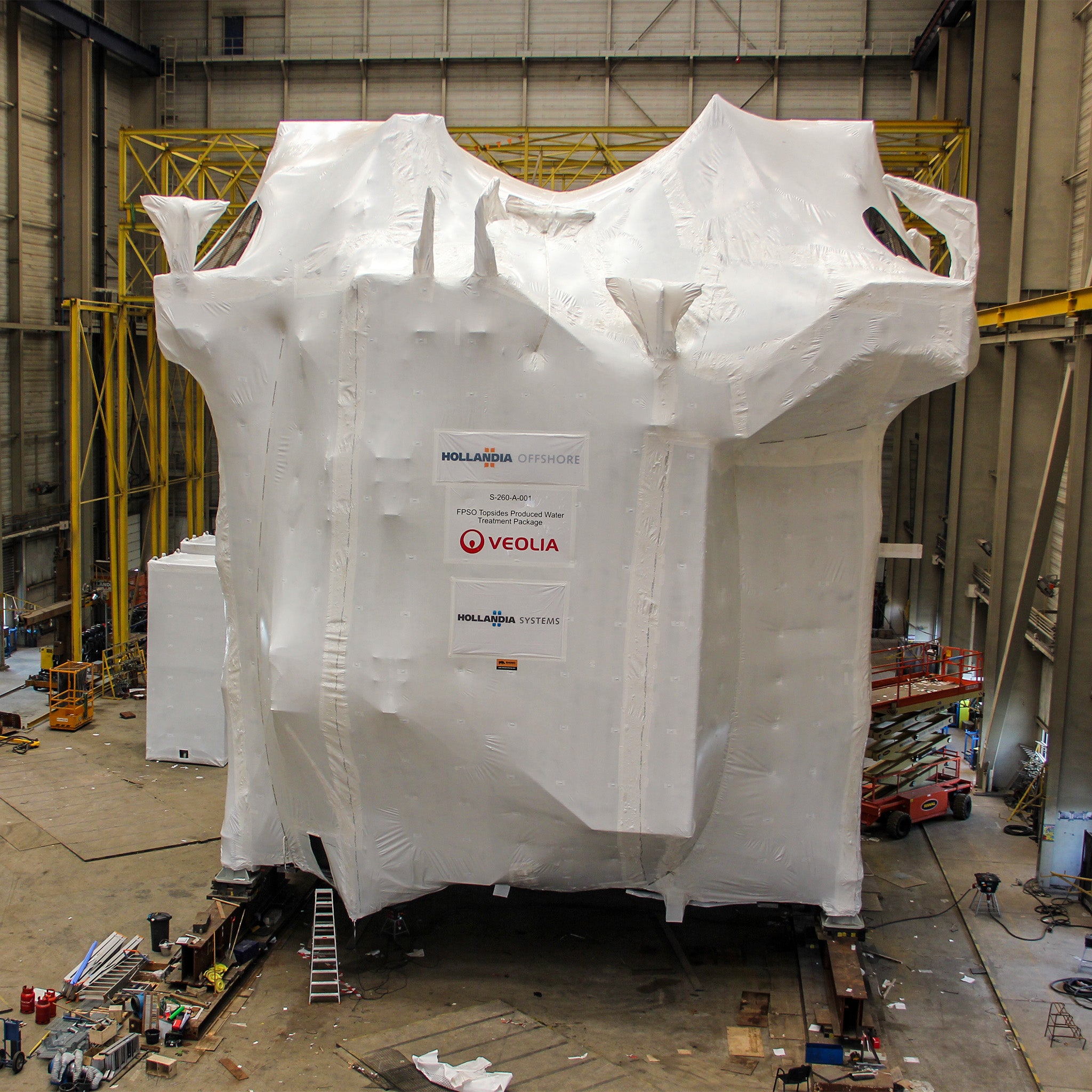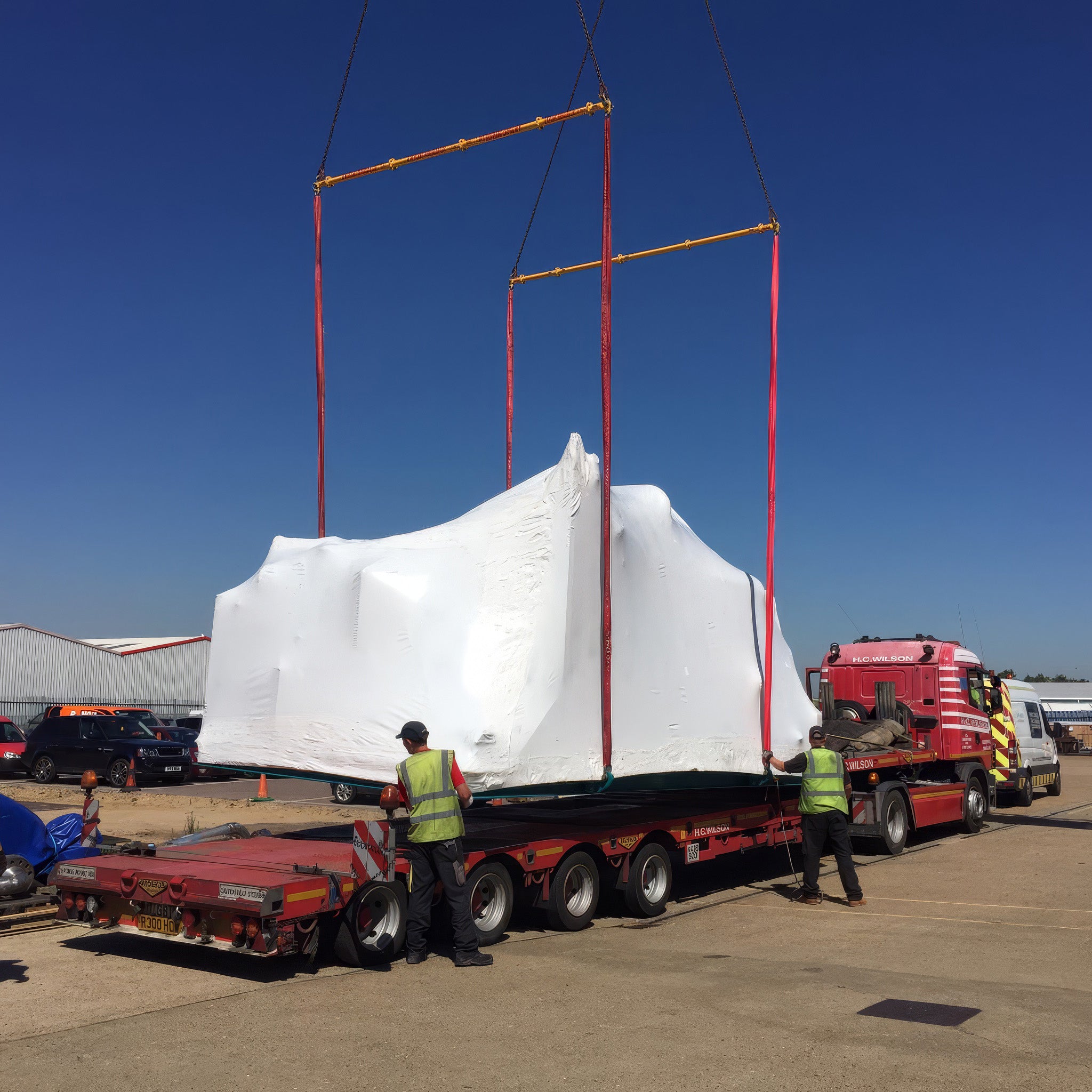 About This Project The Evaporator D project at Sellafield is currently the largest nuclear project in the United Kingdom. The ‘Evap D’ facility, once completed in 2016, will treat liquid radioactive waste so that it can be vitrified ready for disposal. Essentially Evap D acts like a giant kettle, reducing the volume of liquid nuclear waste before it is turned into glass and stored. The £300 million contract for the construction of the Evap D facility was awarded to Costain who used innovative off site construction techniques to pre fabricate the facility as 11 huge ‘modules’ at a specially adapted 5 acre factory site near Ellesmere Port in the North West of England. This was the first use of modular construction for a process plant at the Sellafield site. The construction of the eleven Evap D modules represented a complex engineering challenge. The largest of the modules, ‘Module 920’ weighs 525 tonnes and is 27 metres long, 7 metres wide and 12 metres high. In Module 920 alone there is over 5000 metres of high integrity stainless steel pipework constructed to the most exacting nuclear industry standards. The project logistics provided an additional challenge. How could such huge modules be completely protected against weather damage during the 65 mile journey by road & sea from the manufacturing facility to the construction site? Any salt water entering the modules and into the many stainless steel pipes & welds that the modules contained could have serious implications for the future safe operation of the nuclear facility and delay this high profile construction project for many months. Therefore, a temporary sheeting solution was needed that guaranteed, whatever weather conditions were experienced, it would not fail. Shrink Wrap Covers After months of tests, including some on site demonstrations of the industrial shrink wrap process, Costain and construction partners Interserve chose a shrink wrap covering as their preferred transport protection solution. However, as the Evap D modules did not have any solid sides, there was concern that, even after heat shrinking tightly, high winds could push the shrink wrap into large ‘voids’ behind the sheeting and cause damage. The customer suggested something never tried before which was to cover the entire Evap D module in a HDPE plastic mesh to form a ‘support structure’ beneath the shrink wrap. A geotechnical mesh product that had been designed for installing underground to stabilise soil was hung around the module and secured to the module using a woven strapping. Next, working from the outside, using ‘cherry pickers’, 12 metre wide sheets of 300 micron thick shrink wrap sheeting were hung and heat welded together before being shrunk ‘drum tight’. The final step, to make the shrink wrap cover ‘bomb proof’, and to provide the 100% guaranteed weatherproof protection that this project required from the temporary sheeting was to make a small hole in the shrink wrap sheeting every 1 square metre and pass a velcro tie through the shrink wrap and around the mesh. (The hole was later taped to maintain a weatherproof seal). It was felt, that with the shrink wrap shrunk tight AND tied back to the supporting mesh every 1 square metre this was the most robust solution that could be designed. Project benefits from shrink wrap Heat shrunk ‘drum tight’ – very resistant to damage from high winds. Heat sealed joints between sheets created a completely weather tight, full encapsulation of each module. Smart & professional appearance for a high profile project. Easy to remove in sections at the construction site & 100% recyclable. Lessons Learnt The final module was delivered from Ellesmere Port to Sellafield by specialist barge ‘Terra Marique’ in September 2013. After shrink wrapping 11 modules, over a 2 year period, the weather proofing of the giant modules using shrink wrap sheeting was a 100% success, with no sheeting failures or water ingress.
