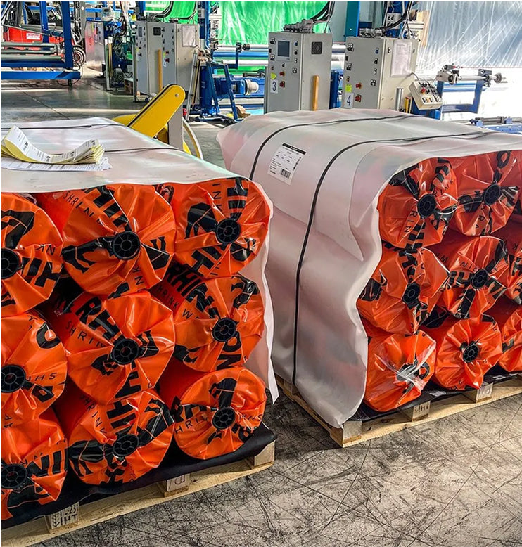 Finally, rolls of shrink wrap are packed on to pallets for shipping.