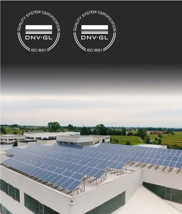 Production facility equipped with photovoltaic panels to integrate the energy required for manufacturing. Plastic waste from factory converted into packaging material for internal use.