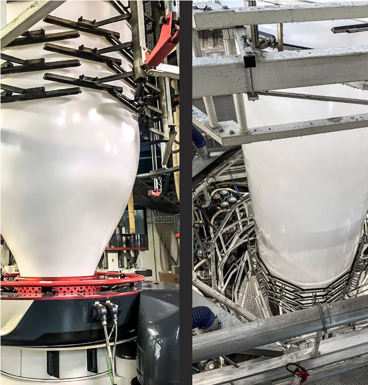 The molten polymer mixture is pushed through a ring of nozzles, usually known as a ‘die’. Air is injected via a hole in the centre of the die to inflate the polymer into a tube or bubble. This tube extends upwards 15-20m (45-65’). The circumference of this bubble determines the width of the finished film.